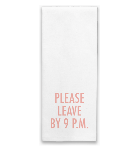 For hosts who love good company and an early bedtime. Our “Please Leave By 9 PM” kitchen towel brings a playful touch to your kitchen, bar cart, or gift basket. Made from soft, absorbent cotton, it’s as practical as it is cheeky—perfect for drying dishes, lining bread baskets, or hanging on display for a guaranteed chuckle.