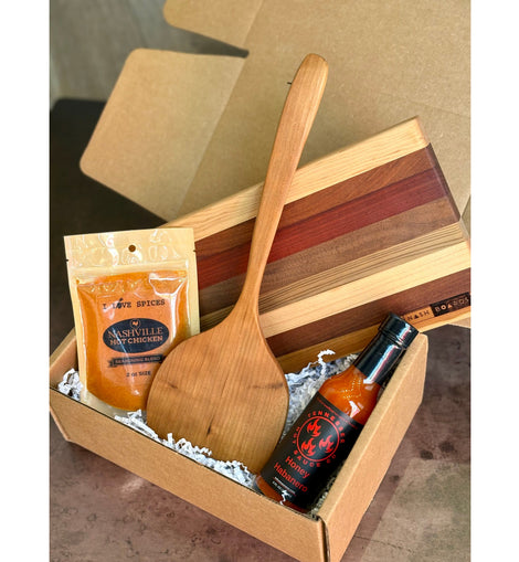 This grilling-ready collection includes a Petit Cutting Board — the perfect size for a steak — along with a handcrafted wooden hamburger flipper, Nashville Hot Chicken seasoning blend, and Honey Habanero Hot Sauce. Each piece celebrates the bold flavors of Nashville while highlighting artisan craftsmanship.