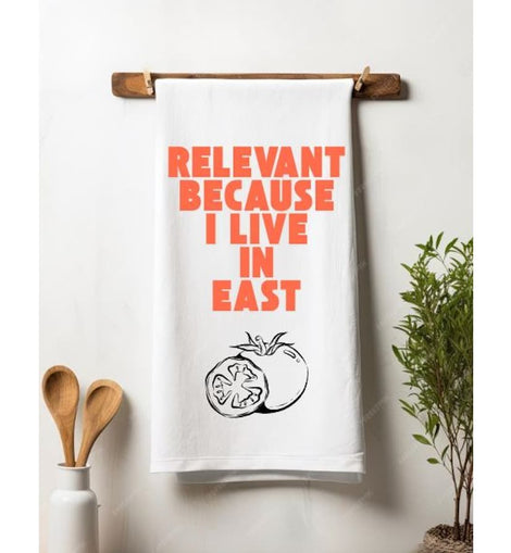 Show off your neighborhood pride with our cheeky “Relevant Because I live in East” tea towel — the perfect blend of sarcasm, and local love. Whether you're wiping up spills or just making a bold statement in your kitchen, this East Nashville-inspired towel brings personality to any space.