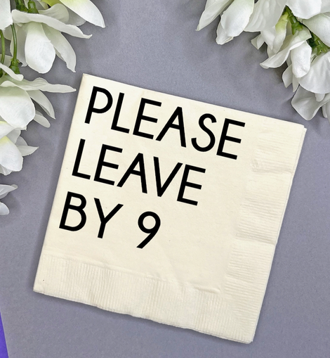 We call these hint, hint cocktail napkins. Send the message without having to say it with these "Please Leave by 9," cocktail napkins!